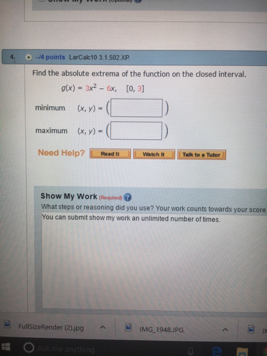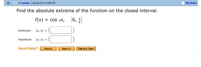 Solved: Find The Absolute Extrema Of The Function On The C ... from d2vlcm61l7u1fs.cloudfront.net Evaluate f at the critical values from step 1 and at the endpoints a and b. Extreme value theorem if f is a continuous function and closed on the interval [. Dummies has always stood for taking on complex concepts and making them easy to understand. Finding absolute extrema on a closed interval. Dummies helps everyone be more knowledgeable and confident in applying what they know. From the previous section, we know that if a function is continuous on. › verified 6 days ago. Is 0 in this integral?